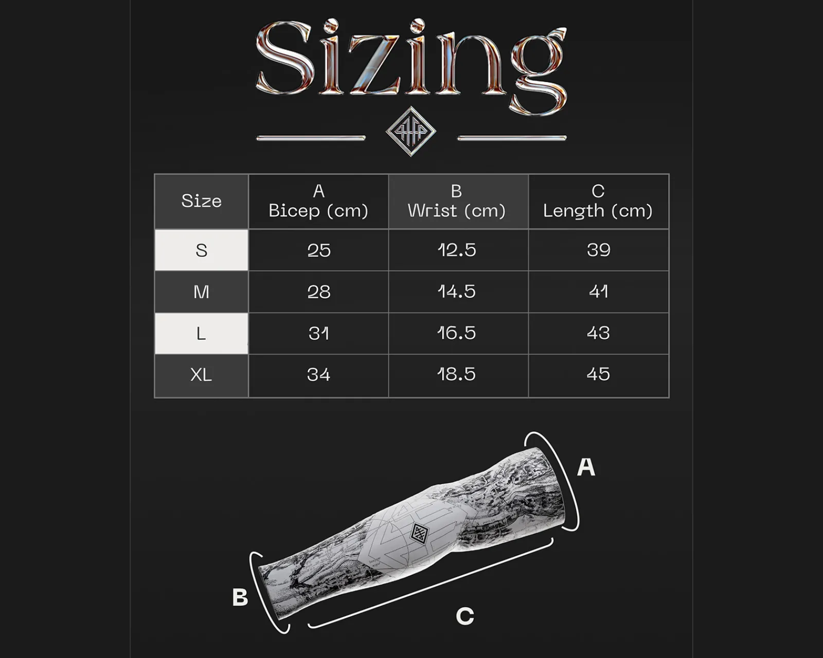 XL: Wrist: 18.5CM, Bicep: 34CM, Length 45CM