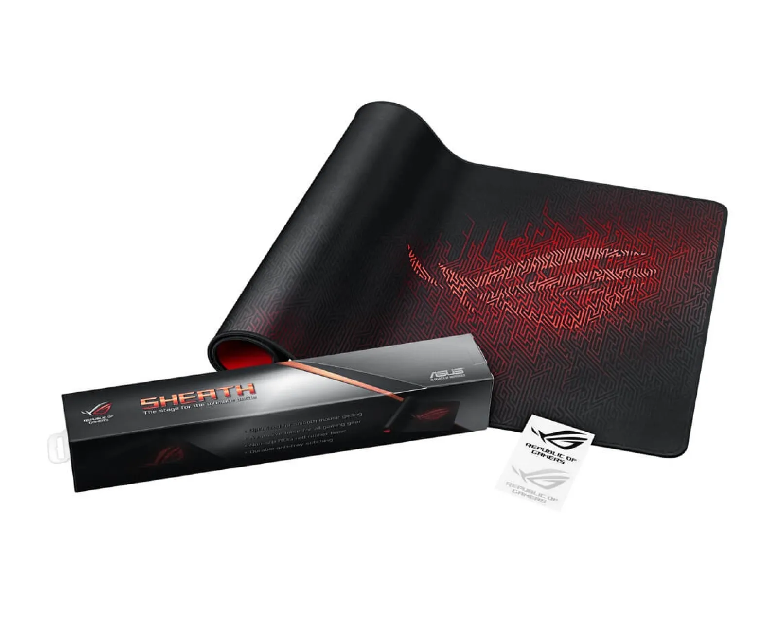 The extra-large ASUS ROG Sheath mouse pad is optimized for all gaming mouse types, with a smooth surface that perfectly ensures pixel-precise tracking for unmatched command and control. ROG Sheath is designed for your comfort and features a non-slip ROG-red rubber base that keeps it in place and stitched edges that resist fraying.