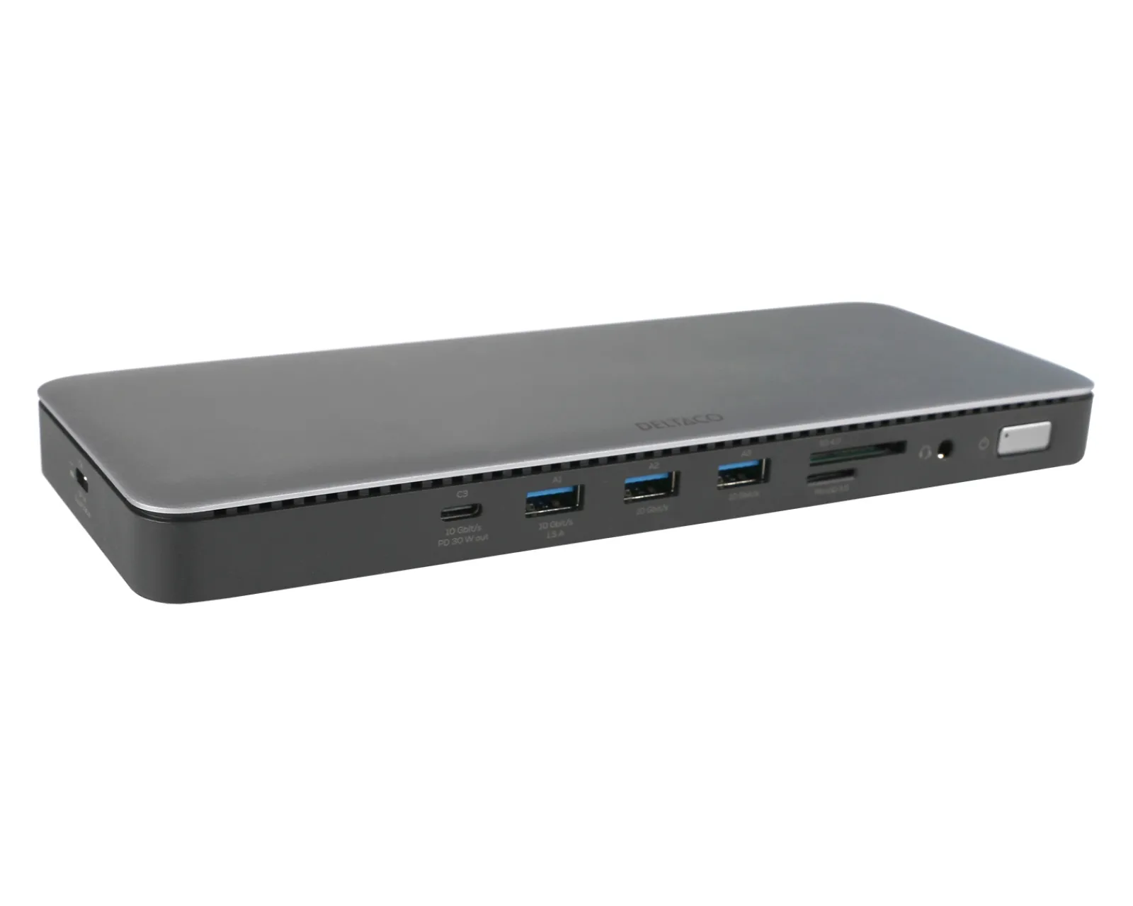 With 2x HDMI ports and 2x DP ports, sharp image quality and flexibility with multiple screens are ensured. SD/microSD ports for easy file transfer, an RJ45 port that gives you up to 1 Gbit/s for fast network connection, and 3 USB-A ports for fast data transfer of up to 10 Gbit/s for smooth connection of external devices. You also have 3x USB-C connections with up to 10 Gbit/s, a USB-C female, DC female, and a 3.5 mm connection to cover everything you may need.