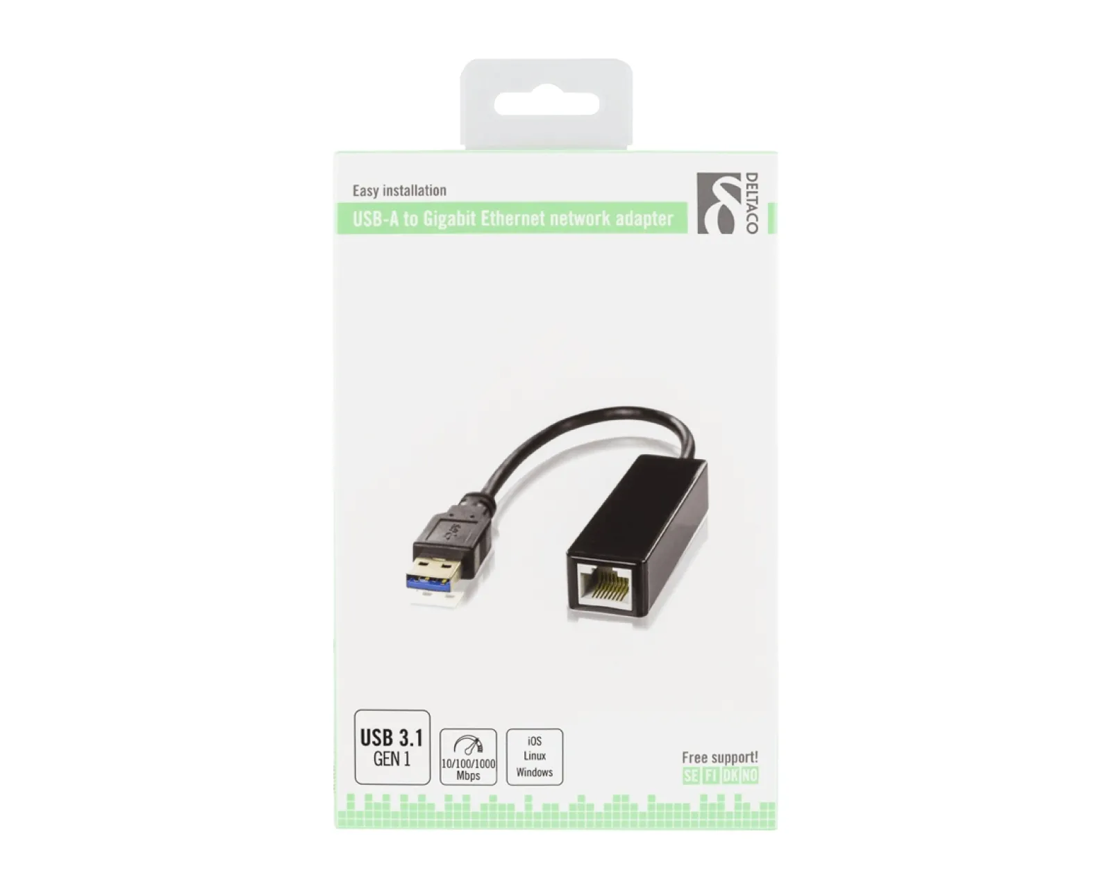 DELTACO USB 3.0 network adapter with internal flash memory, Gigabit, 1xRJ45, 1xUSB3.0 Type A ha, black