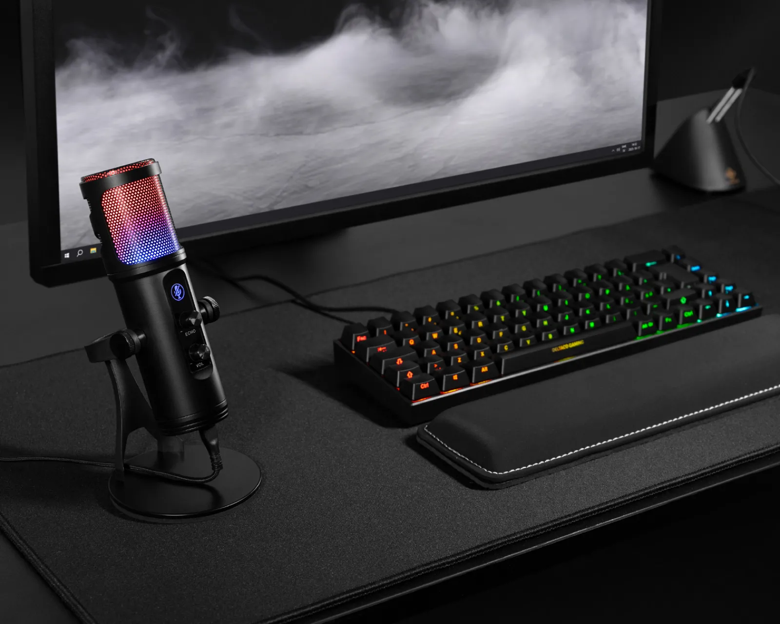 If you like to customize and adapt your gaming environment to something unique, then this microphone with RGB effect is the perfect accessory. Get a more visually appealing set-up for yourself and the audience from the streaming. Thanks to the integrated reverb control and the volume control on the microphone, you can easily adapt to how you want it. Create a professional sound smoothly, all you have to do is turn the knob. The plug-and-play connection makes the whole process even easier.