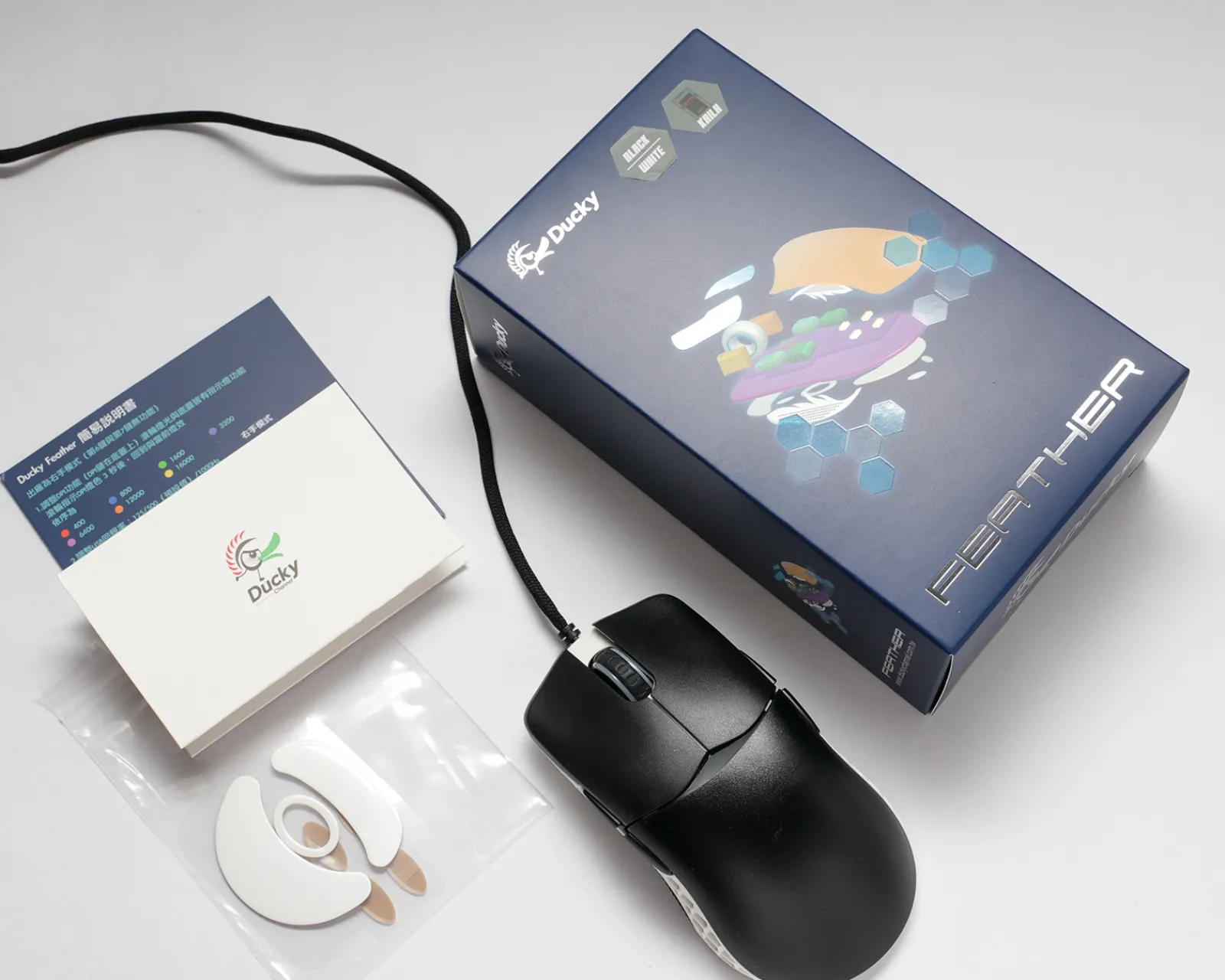 The Ducky Feather Black and White Gaming Mouse is a uniquely designed device that will take your gaming experience to the next level. This gaming mouse weighs a light 65g and is perfectly balanced, and sits comfortably in your hand like no other. Its ambidextrous design works great with both hands making it suitable for everyone. Its Optical PixArt PMW3389DM sensor offers an improved maximum resolution of 16,000DPI combined with the mid-height chassis that provides incredible accuracy and speed.