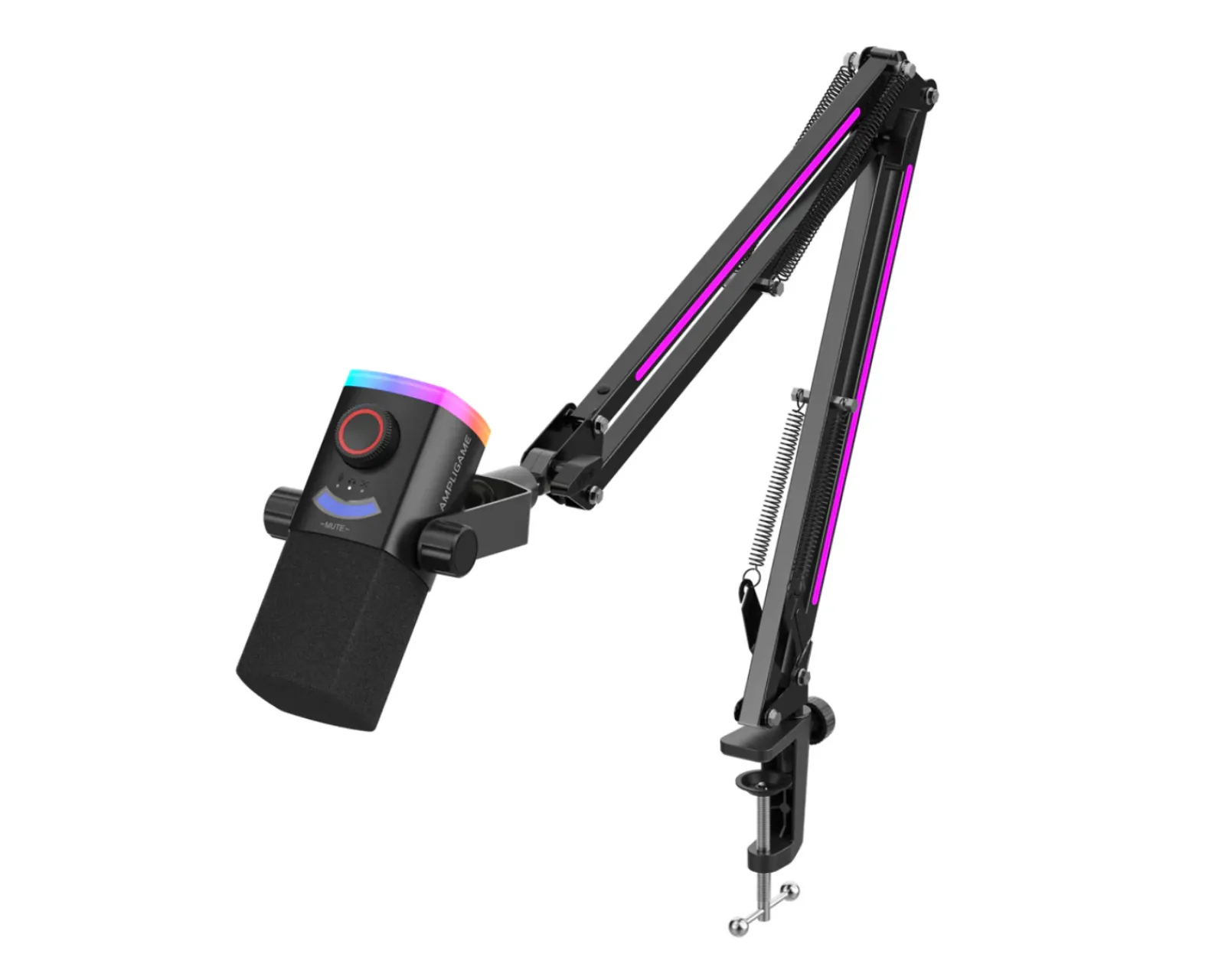 AmpliGame AM8PROT is a dynamic microphone from Fifine designed for content creators and streamers. The microphone features a uni-directional polar pattern that focuses on voice pickup, minimizing background noise. The frequency response ranges from 50Hz to 16kHz and it has a sensitivity of -50±3dB. The microphone is equipped with an RGB feature that includes three different modes and eight single-color light effects. It connects easily to computers via USB Type-C, enabling Plug&Play use. Additionally, a boom arm and a windscreen are included to enhance sound quality and user-friendliness. It is ideal for podcasts, livestreaming, and voice recording.
