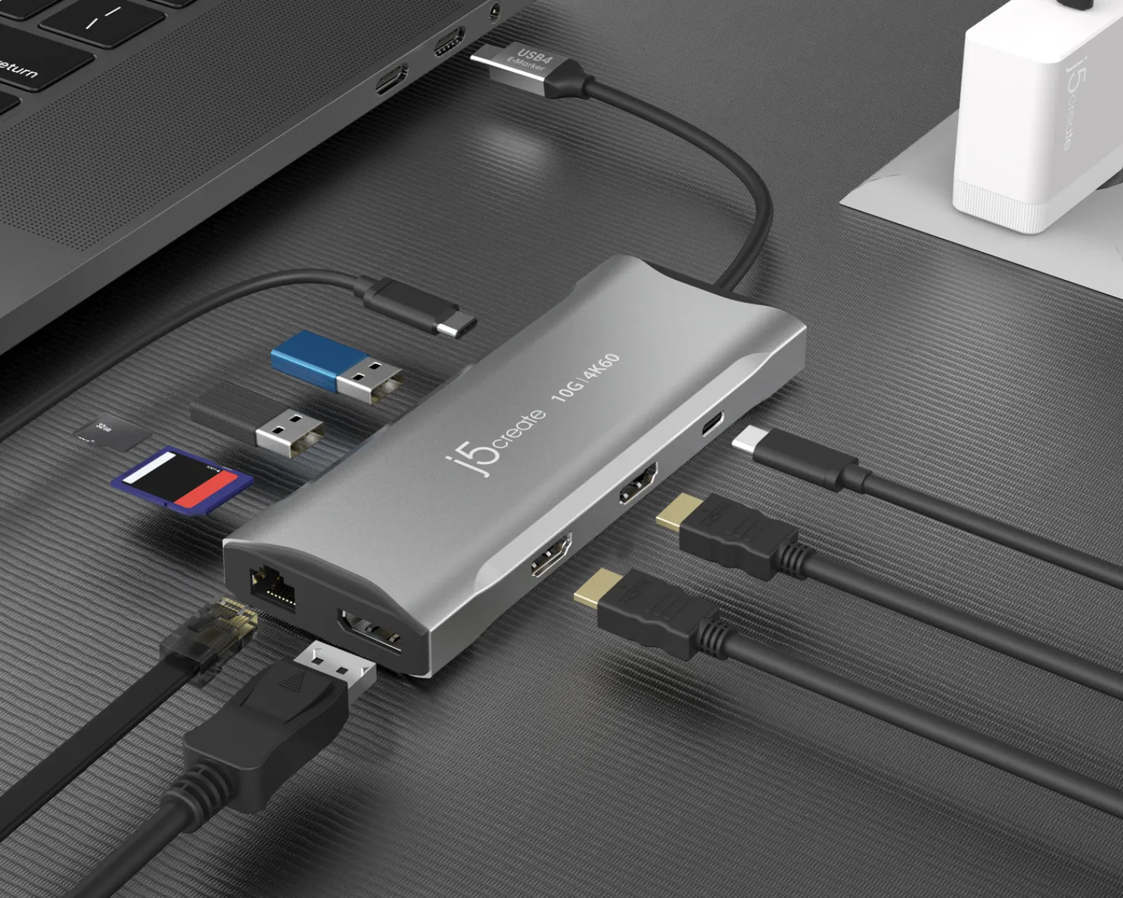 This premium docking station from j5create gives you versatility! The 4K60 Elite USB-C Triple-Monitor 10Gbps Mini Dock features an advanced USB E-Mark chip for USB4 hosts and devices. This compact mini dock has everything you need from triple video outputs to 10 Gbps USB ports and a 100W power supply, so the docking station can also be used to charge your laptop.