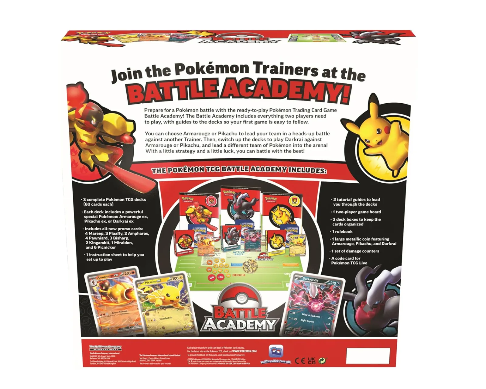 Start your journey into the world of Pokémon with Pokémon TCG Battle Academy – the perfect introduction to the Pokémon Trading Card Game! Whether you’re a beginner or an experienced player, you’ll have the opportunity to familiarize yourself with the game’s strategies and learn the basic rules with the help of two educational guides included in the package. Discover the excitement with three complete decks, each containing 60 cards, with each deck featuring its own special Pokémon – Pikachu ex, Armarouge ex, or Darkrai ex. Each deck is carefully crafted to offer unique gameplay and strategic opportunities for you and your fellow players.