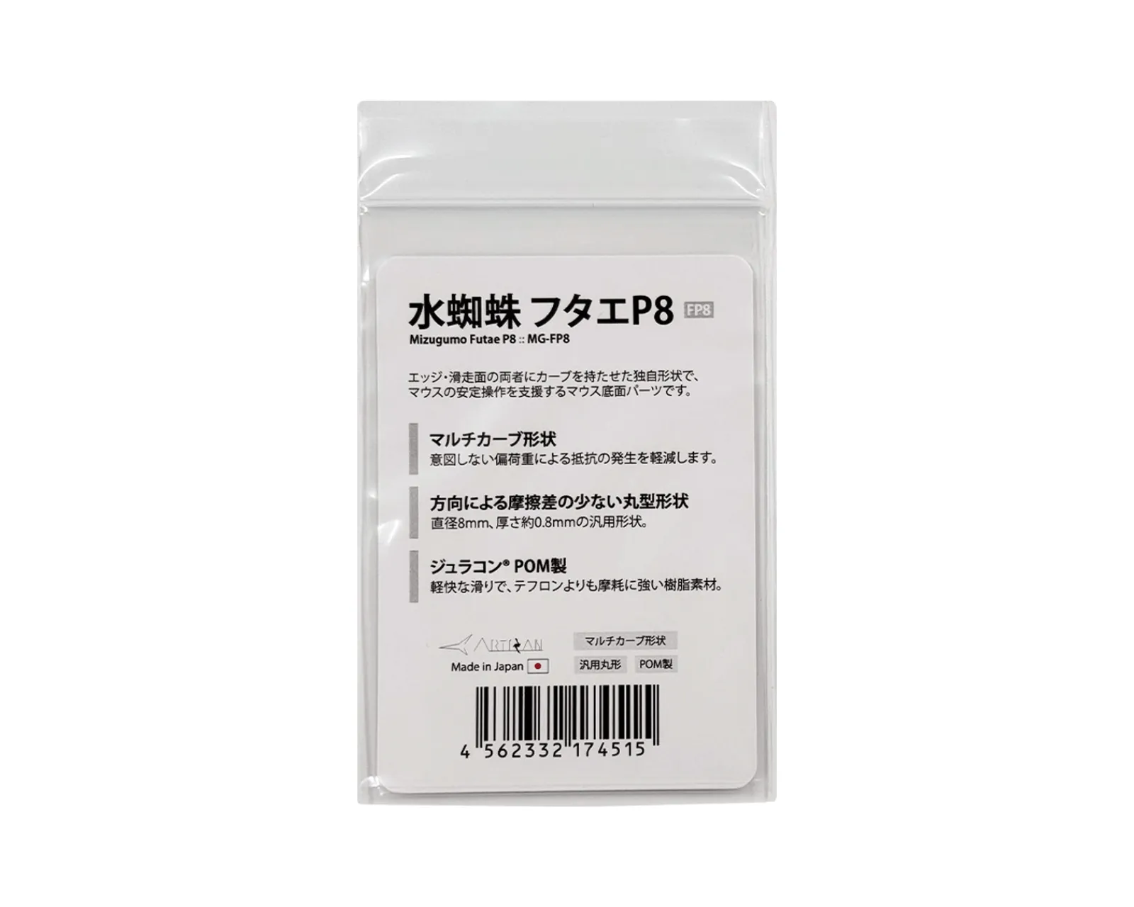 MIZUGUMO FUTAE P8 Mouse Skates are the perfect choice for those looking for superior precision and performance when using their computer mouse. These innovative mouse feet are designed with a unique double ?multi-curve shape?, which combines rounded edges and a slightly curved contact surface. The result? A smoother and more stable gliding surface that gives you an unparalleled gaming and working experience. With a diameter of 8 mm and a thickness of 0.8 mm, they offer both agility and durability. Made of the durable Duracon® POM material, the MIZUGUMO FUTAE P8 minimize changes in gliding performance, even with prolonged use. Perfect for gamers and professionals who demand precision in every movement.