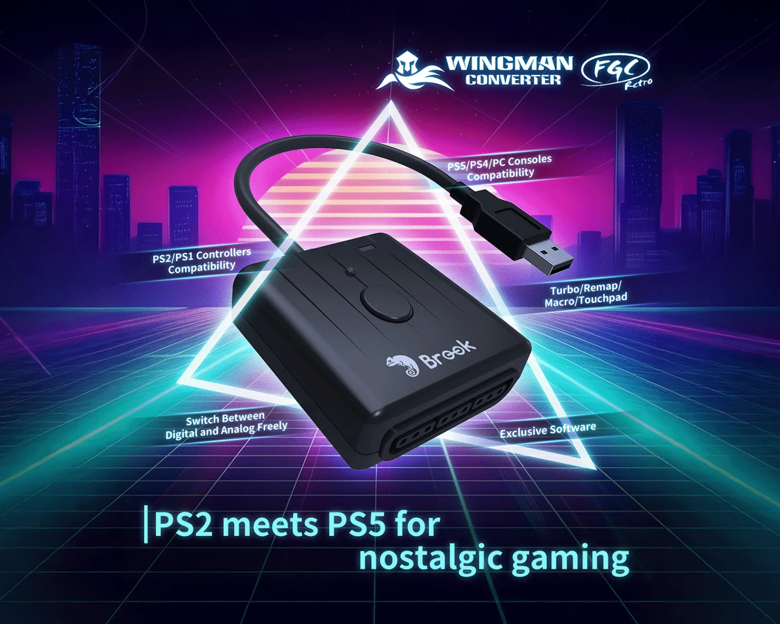 Wingman FGC Retro is an adapter from Brook that allows the use of PS2 and PS1 controllers on modern consoles such as PS5 and PC. The product gives players the opportunity to revive the classic gaming experience with modern platforms. It supports both digital and analog modes and is suitable for retro enthusiasts as well as e-sports players who strive for precision and functionality. The adapter’s design offers full support for Turbo, Macro and Remap functions. This allows players to adapt their playstyle and streamline their command chains, which is crucial for both casual and professional gaming situations. With Turbo settings that allow you to adjust the rapid fire rate over five steps, you can achieve tactical advantages in intense battles.