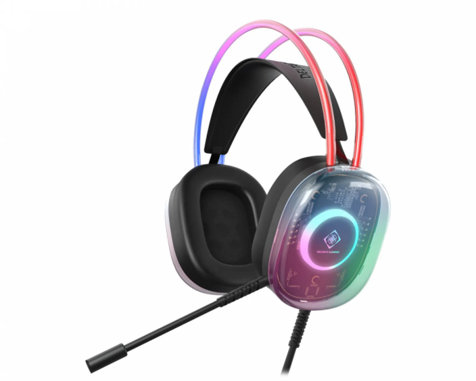 Step into your gaming world with the Deltaco Gaming DH230 Semi-transparent Gaming Headset, where bold design meets immersive audio. The DH230 doesn’t just deliver sound; it creates an atmosphere. Rainbow RGB lighting shimmers through both the headband and the transparent ear cups, setting the mood for every match and making your gaming setup a visual statement.