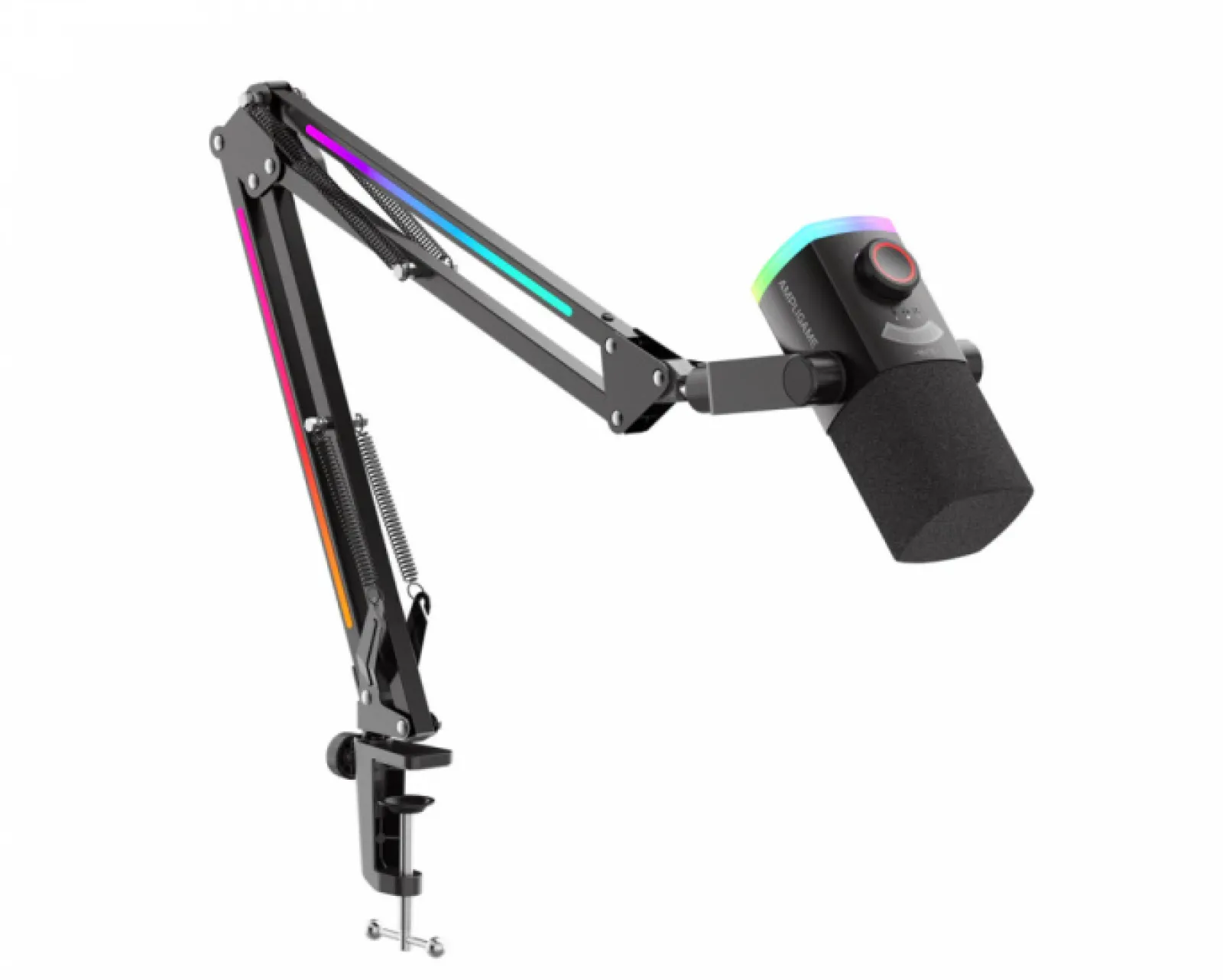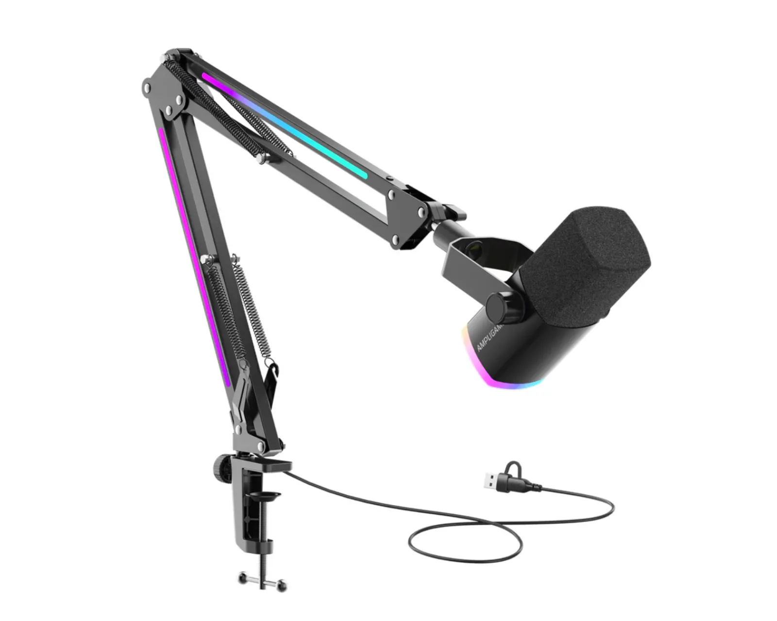 AmpliGame AM8PROT is a dynamic microphone from Fifine designed for content creators and streamers. The microphone features a uni-directional polar pattern that focuses on voice pickup, minimizing background noise. The frequency response ranges from 50Hz to 16kHz and it has a sensitivity of -50±3dB. The microphone is equipped with an RGB feature that includes three different modes and eight single-color light effects. It connects easily to computers via USB Type-C, enabling Plug&Play use. Additionally, a boom arm and a windscreen are included to enhance sound quality and user-friendliness. It is ideal for podcasts, livestreaming, and voice recording.