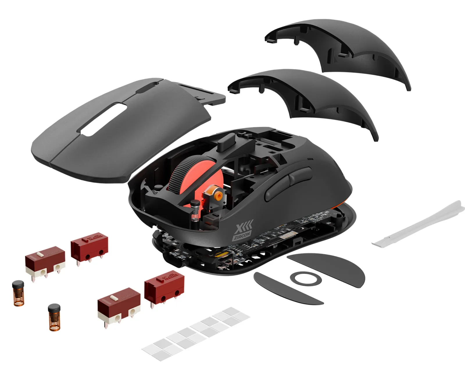- Micro switches: Replace the main button switches with up to two additional types included in the set, such as the Huano Silent switches.