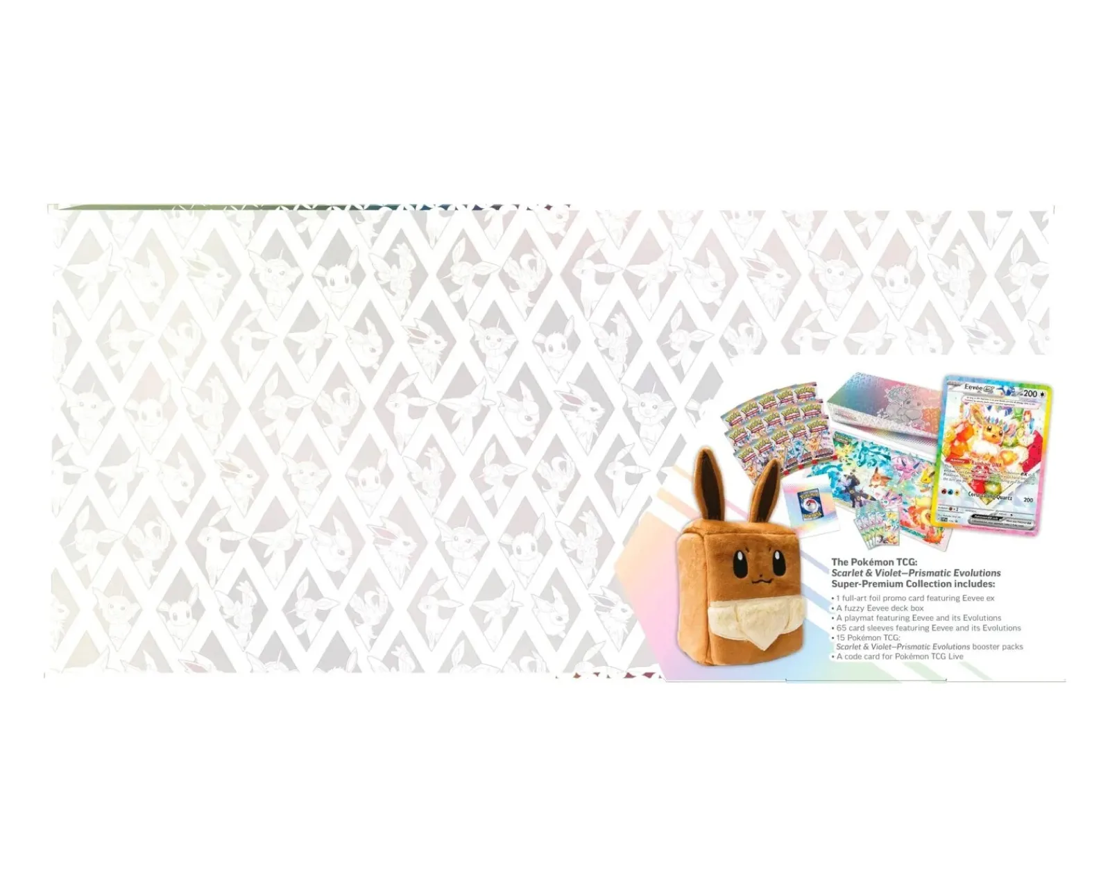 Eevee and its evolutions spread friendship and joy wherever they go, and with the adorable accessories in this collection, they’re sure to bring that same happiness to your next big game! Inside, you’ll find a special rare-style promo card featuring Eevee as a Stellar Tera Pokémon ex, ready to evolve thanks to its Rainbow DNA. You’ll also get a fuzzy Eevee deck box, a playmat, and a full set of sleeves featuring stunning artwork of Eevee and its evolutions, and more than a dozen boosters from the special Scarlet & Violet?Prismatic Evolutions expansion.