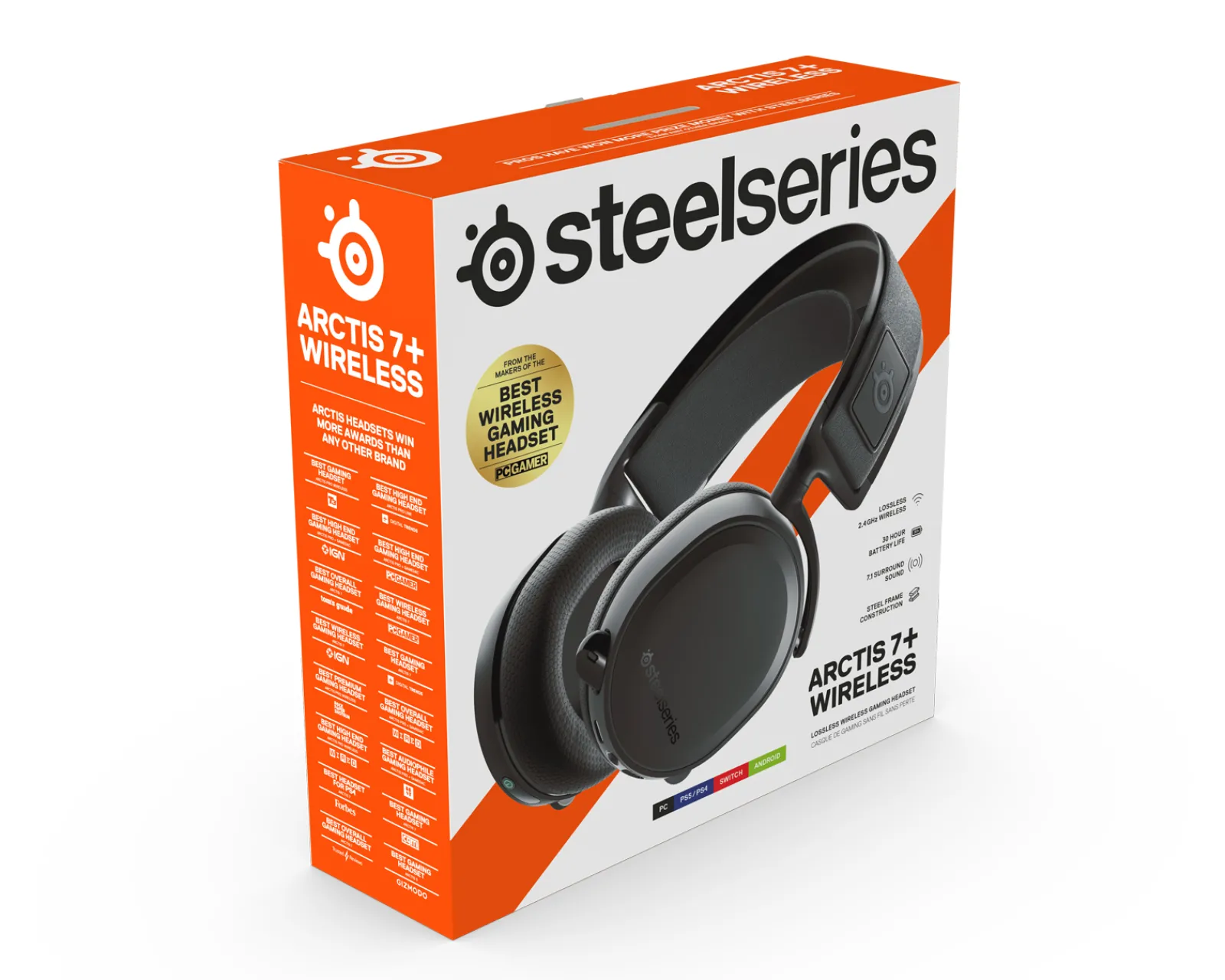 The SteelSeries Arctis 7+ Wireless headset is designed specifically for multi-system compatibility (PC, PlayStation, Mac, Android, and Switch) with 7.1 Surround Sound on PC. It uses lossless 2.4 GHz wireless audio for ultra-low latency gaming audio via a compact USB-C dongle (USB-A adapter included). It has a 30-hour battery life for nonstop gaming with USB-C charging, easy on-ear headset controls including ChatMix, a durable lightweight steel frame and adjustable elastic ski goggle style band for comfortable fit. The ClearCast mic – the best in gaming – is also retractable and features an LED mute indicator.