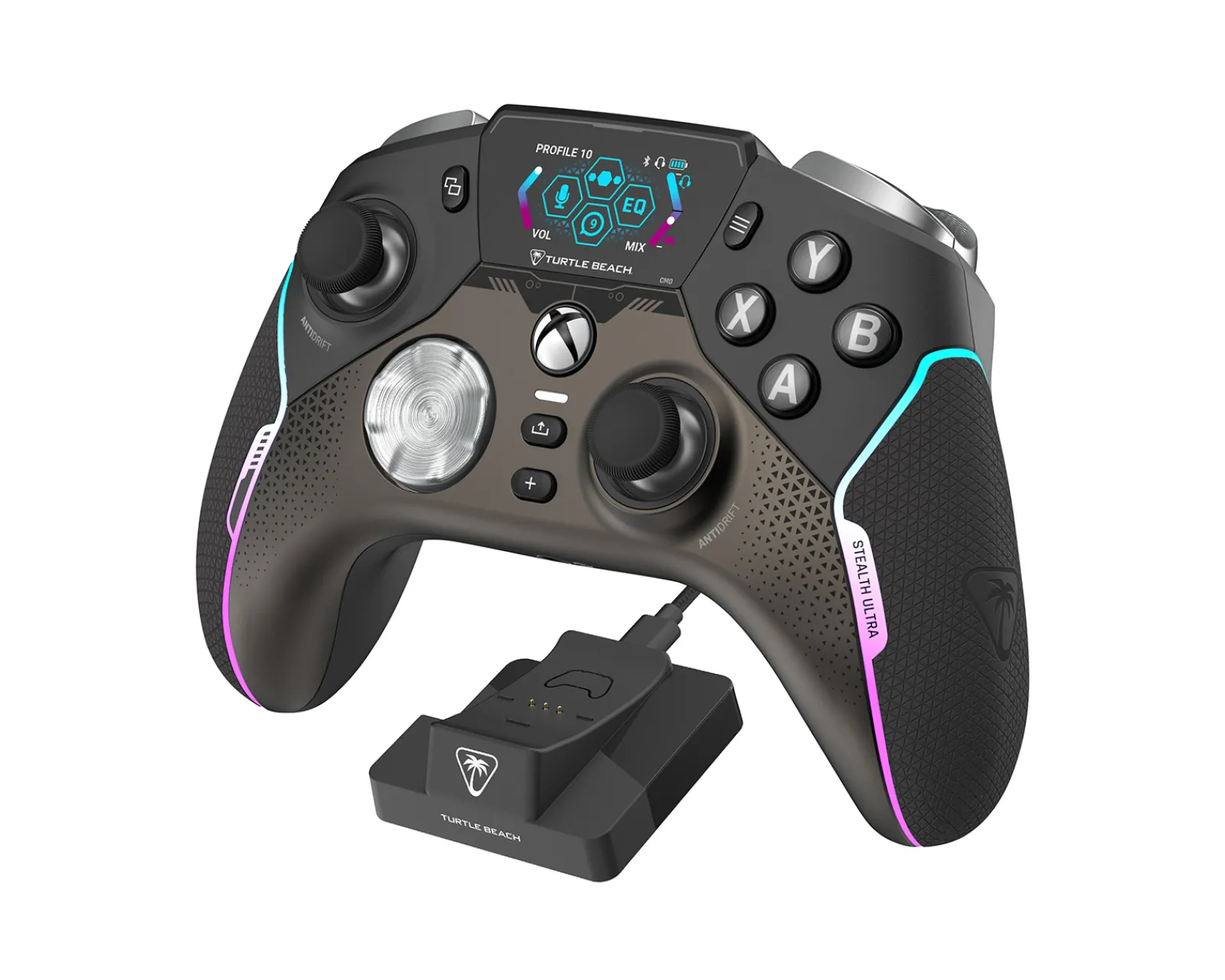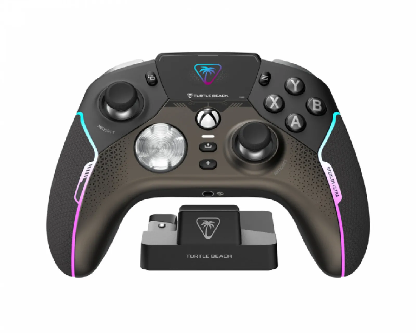 Introducing the Turtle Beach Stealth Ultra Wireless Controller – the ultimate high-performance wireless controller. With ultra-fast lag-free 2.4GHz USB transmission, you can enjoy responsive gaming without wires. The integrated charging dock provides quick and convenient charging and the connected command display features full customization and social media notifications for the ultimate gaming experience.